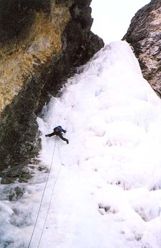 Обедното слънце бе размекнало снега, правейки го доста неприятен за предвижване. За моя радост открих пъртина водеща до основата на Stairway to Heaven. В 12:35 ч започнах да катеря. Високо над мене се катереше свръзка от трима, а зад мене имаше още една свръзка от двама, приготвящи се да катерят същия маршрут. Малките тераси между първо, второ и трето въже ме предпазваха от падащия лед. Условията бяха много добри и ледът бе доста пластичен. За кратко време застигнах първата свръзка в основата на трето въже. Свръзката беше съставена от един гид и двама клиенти, приготвящи се да го последват един след друг по трето въже. Бе твърде опасно да катеря под тях, а и бе против катерачната етиката да ги задмина. Наложи се да чакам в продължение на 25 мин докато и двамата се скриха от погледа ми. Закатерих доста бързо и нервно докато в един момент чух някой да вика "ЛЕД". Погледнах нагоре и с ужас видях как ледено парче с размерите на телевизор се носеше в моята посока. Аз се прилепих до леда, а парчето с грохот се разби на малката площадка над мен, като ме засипа с множество по-малки парчета. След утихването на всичко, чух как някой извика "ИЗВИНЯВАЙ". От там продължих до малката площадка над мене и траверсирах в ляво, където изчаках в продължение на 15 мин. След като всичко се поуспокои аз продължих да катеря, застигайки първата свръзка в основата на пето въже. Часовника ми сочеше 14:05 ч. Закъснението ми се бе увеличило с час и тридесет минути. Основата на пето въже представляваше една сравнително голяма площадка, на която човек спокойно можеше да си отдъхне без да се притеснява от падане. Гледката от тази площадка ми позволяваше да разгледам подробно отсрещните склонове на долината, където се намираха и двата оставащи ми маршрути, Second Gully, и Gold Rush. В ляво от двата маршрута ясно се виждаха пораженията от голяма лавина, свлякла се от по-горните склонове. Долу, речното корито бе преградено от десетки метри дебел слой от лед, сняг, скали и дървета, довлечени от голямата лавина. За мой ужас, склоновете над Second Gully, и Gold Rush седяха непокътнати. Няколкометров слой от навят сняг висеше на склоновете над двата тура, превръщайки ги в зеещ гроб за всеки дръзнал да катери по тях. След кратка консултация с гида, който подготвяше рапела за своите клиенти, аз реших да се откажа от двата тура а с тях и от амбициите ми за каквото, и да е постижение. Следобедното слънце напичаше, правейки снега доста тежък и неустойчив. Гидът, с когото, както се оказа, се бяхме срещали и преди, нямаше намерение да продължава да катери, поради нестабилното състояние на снега. Клиентите му бяха две млади момчета от Чикаго, които бяха на почивка в Колорадо. След кратък разговор и разчупване на шоколад се разделихме. Те потеглиха надолу, а аз продължих по пето въже със спокойно темпо. Това красиво 55 метрово въже ме отведе до малка площадка, водеща до последните две въжета, съставени предимно от WI3 лед. Площадката бе запълнена от 70 см дълбок, мокър сняг, стоящ на наклонена ледена основа. Мястото бе доста опасно, поради което се наложи много внимателно да се придвижа до първото от поредицата ледени стъпала. В основата му усетих как склона под мене започна бавно да поддава. Забих сечивата и котките си здраво. Склона спря да се свлича но не за дълго. Бе глупост да продължа при тези условия. Извадих една 22 см цев и започнах да рабо