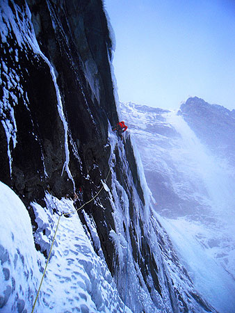 Следващият междинен пункт за осигуряване можеше да бъде поставен няколко метра по-нагоре. Цялото това въже отне на Лайхтфрийд час и половина. По-нататък въобще не беше по-лесно – отвесен лед, ледена драперия, висяща от ръба на тавана. Ледът в този участък беше толкова тънък, че много често човките на сечивата удряха в скала.