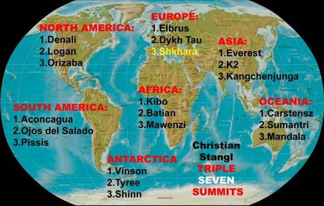 23 август 2013 г. ще бъде записан в историята на алпинизма. Изкачвайки Шхара в Кавказ, на този ден австрийският sky runner Кристиан Щангл (Christian Stangl) записа в актива си изкачвания на първите три върха на всички континенти.