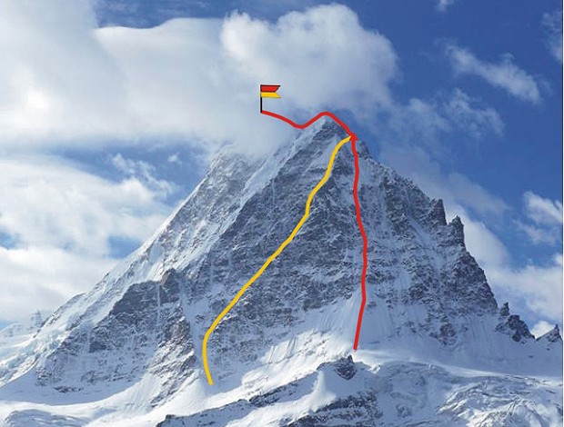 Югоизточният гребен на Хагшу – с жълтата линия е отбелязан маршрутът на първото