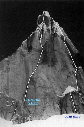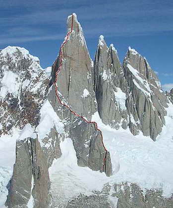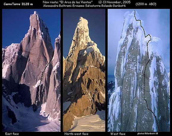 Но нека се върнем към тазгодишното изкачване на Белтрами, Салватера и Гариботи. Новият им маршрут по северната стена, прокаран в алпийски стил, се нарича “El Arca de los Vientos”. Състои се от 37 въжета и е дълъг 1200 метра. Трудността му се оценява с най-високата степен на алпийската скала – ABO (от abominable – страховит, ужасен). (Вж. и снимката в края на статията, бел.ред.)