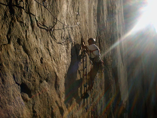Отне ми 4 ч и 60 парчета от екипировката да мина 55 м, всичко беше малки копърхеди и малки клеми в отварящи се цепки, всичко беше ужасно трошливо, само люспи, усещането да поставяш небесни куки на люспи, които се местят е много особено и човек трябва да го изживее за да го разбере. Бях уплашен до дъното на костите си, по цялото въже нямаше нищо, което да може да поеме фал и за капак на всичко в основата имаше наклонена площадка, която чакаше да ме посрещне с отворени обятия и да ме изпрати в болница или...