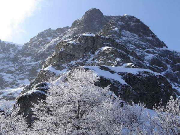 Това е по познатия на мнозина Централен ръб. Първоначално се пресича реката по мостчето с бента на водохващането и се тръгва нагоре по лявото дере. С леко затъване се пробиваше път нагоре до достигане на малка полянка с характерно криво дърво в началото й. От там се отделихме в ляво и право нагоре след около 40 мин. Достигнахме долните редици на горските жандарми, създаващи много ядове на тези дето минават през тях. След дясно подсичане започнахме най-досадната част от подхода – изкачване на лавинния горски улей до основата на реброто, който нарекохме “мега улея” (за разлика от “Хипер кулоара” по-нагоре). От предишни неволи там, знаех, че е много стръмно, дълго и се газят дълбоки снегове. Поне лавината беше паднала и на места снегът беше даже приятно твърд.