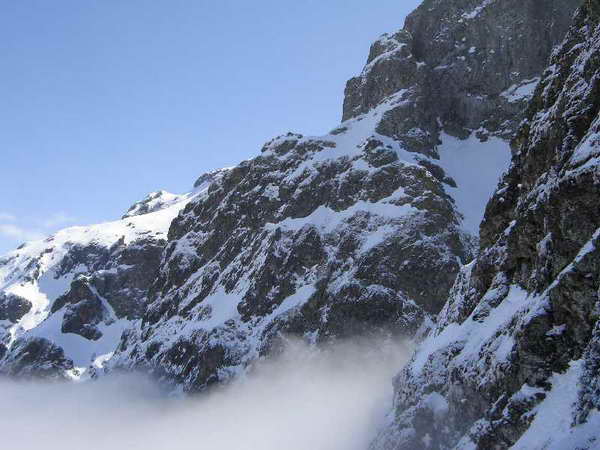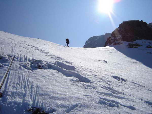 След подобаващо затъване на “Великото джендемско фирново/сега кишаво/ плато” се устремихме към най-добрите лавинарници, известни с това, че избягват отляво трудните скални пасажи на Втората кула, но предлагат редки гледки.