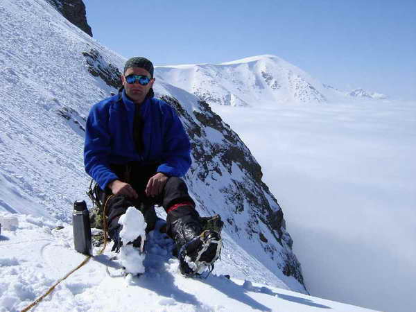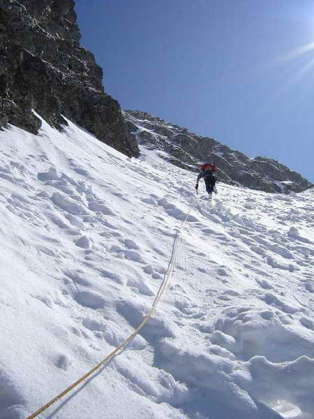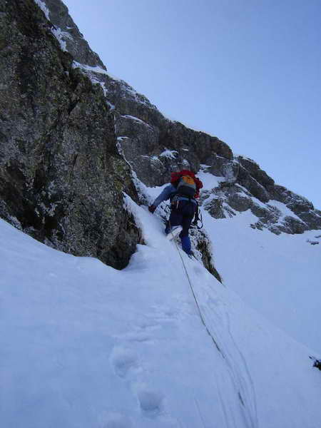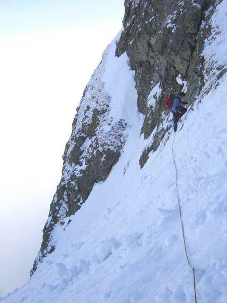 След кулоара се траверсира надясно по леко ледено поле, предлагащо красиви гледки към Млечния чал, Купена и други далечни върхове. Доста се трепери да не се срине снегът и на площадката с реброто се обядва. Първия път тук, през лятото нямахме вода и отворихме бокали с вино, което пихме с водни чаши и за малко да останем на бивак 200 м по-нагоре. Въобще пиенето и алпинизма не трябва да вървят едновременно, а само едно след друго в йерархическа последователност. Преди два месеца, пак тук, студ, силен вятър, а ние закъснели имаме възможността да установим зимъска колко бърже можело слънцето да залязва. Сега обаче е един часа, слънцето спряло, сърдито пече, а ние ядем манджи, стоим и като тримата глупаци на хълма се чудим тва доле дъл е мек памук за търкаляне или бело сирене за ручане...