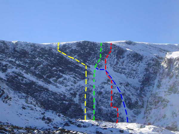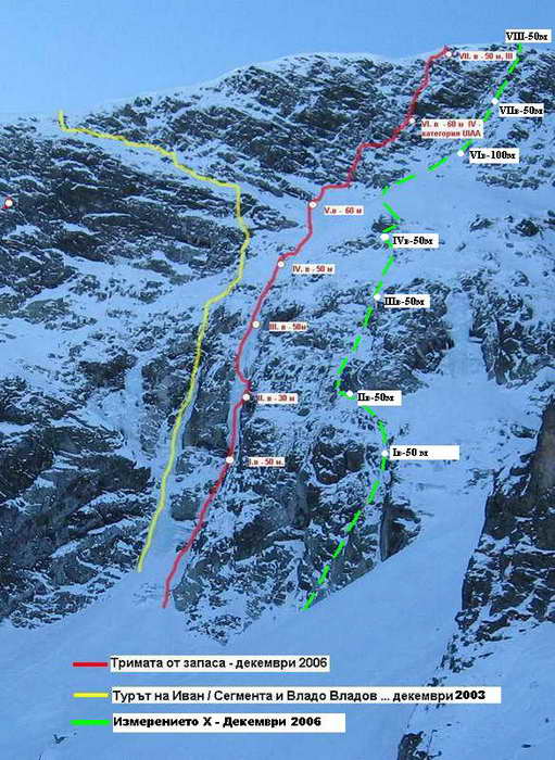 След цяла нощ бурен южен вятър утрото беше меко за сезона и невероятно красиво. До стената достигнахме бързо благодарение на партината от предния ден, но за сметка на това преди да започнем самото катерене падна мъгла и заваля слаб сняг. От предния ден бяхме избрали най-дясното натичане по стената което с напреднане на сезона ще стене много лавиноопасно а сега се беше формирало добре и благодарение на малкото сняг леда е около 40-45м. и има възможност да се излезе до края на стената. Самото катерене по леда е приятно, а след това следва риене в сняг като прасе в........ и за финал катерене по скали и туфи с не голяма трудност. Горната част на стената предлага възможности да се излезе напрактика от всякъде, но предвид намалената видимост до 15-20м. и наличието на следи които пресичане излязохме по тура "Тримата от запаса"