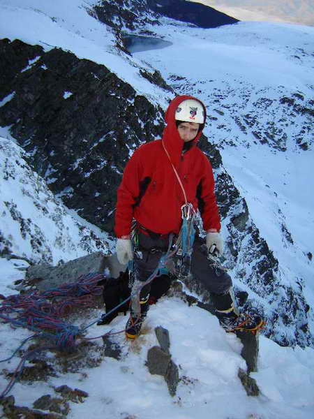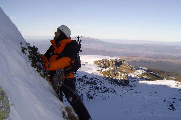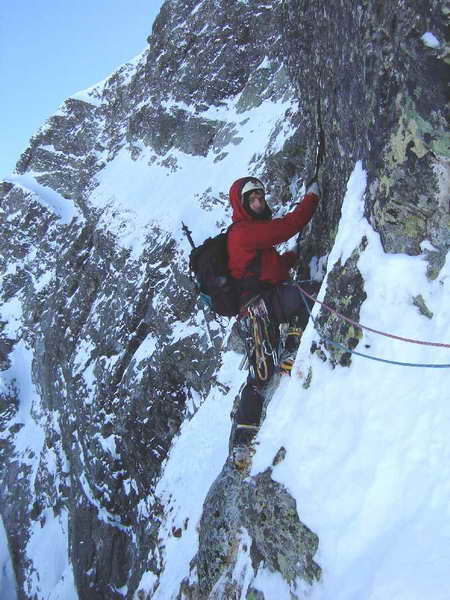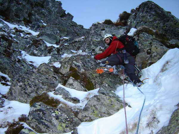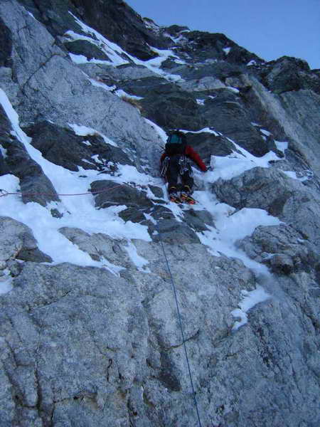 След преодоляване на лавиноопасното 100 метрово поле на „хикса” стигнахме до пъртината на тримата резервисти от миналата седмица. Ние поехме на 15-20 метра вдясно от тяхното творение по разлато ребро преминаващо в кулоар накрая. Тук за щастие има предостатъчно места за осигуряване с клеми и френдове и чудесна площадка в откъртено двуметрово паве в средата на този последен стометров участък. Тук започна да духа и характерния за стената студен вятър, но катеренето вече вървеше към своя край.