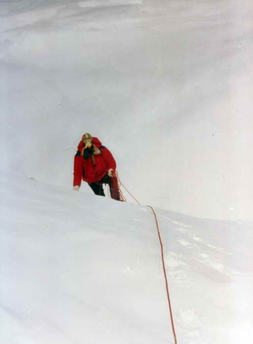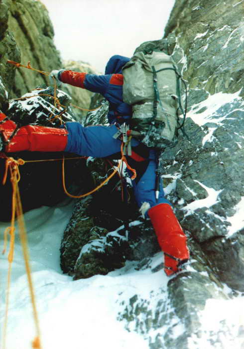 Иван Вълчев в Камината на Манфреда (около 8250 м). Снимка Методи СавовМетоди Савов: Почти през цялото време водеше Иван. Някъде по Жълтия пояс преди Сивата кула на мен ми се развърза котката и тя падна надолу, но се закрепи на една скална издатина. Извиках на Иван да ми отпусне въже за да отида да я взема. Докато се спусках се подхлъзнах на крака останал без котка и направих голям пандюл на въжето. Ударих се в скалата и от това ми пострада коляното... Котката намерих и сложих, но темпото ни спадна рязко.... Това беше момент, в който взехме решение, и то беше - нагоре! Стигнахме върха, беше късно, времето - лошо. Не се виждаше нищо, всичко беше под една педя сняг. Направо продължихме по Югоизточния гребен надолу - не сме и помисляли да ровим и търсим следи от предишните изкачвания. Фотоапарата ми беше замръзнал... Последната снимка която направих с него беше в Камината на Манфреда.