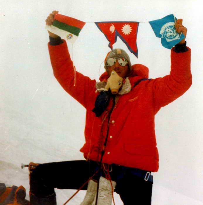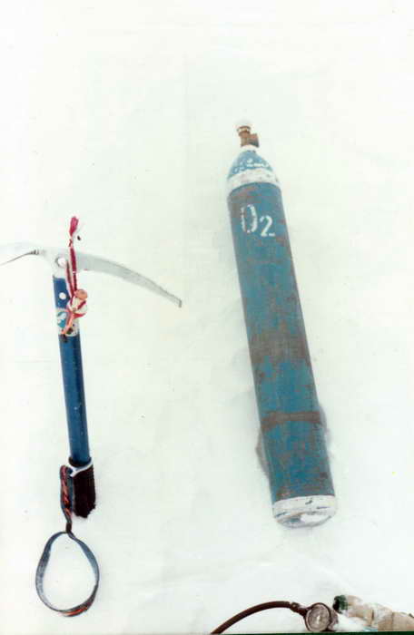 Снимка с флаговете на България, Непал и ООН при достигането си на върха (Кирил Досков и Николай Петков) по Западния гребен в 9:11 ч на 9 май 1984 г., стара кислородна бутилка, която открихме на върха.