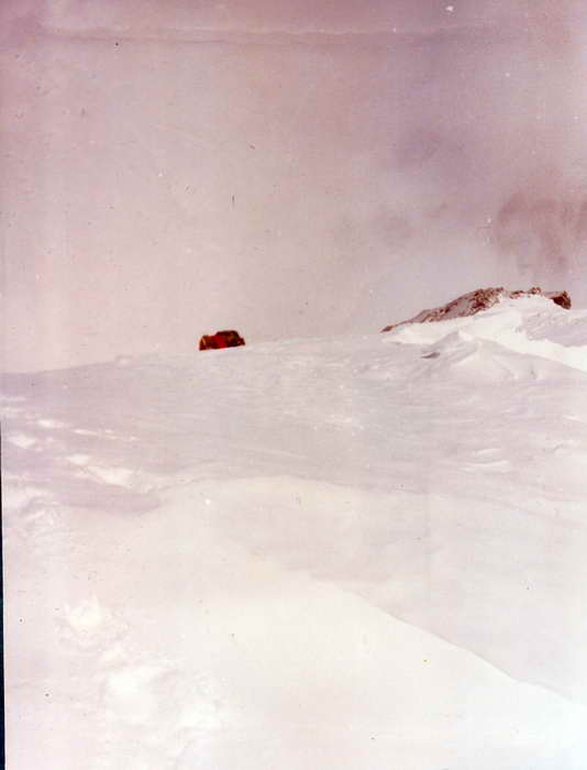 Николай Петков: Началото на слизането ни в погрешна посока към Китай. Кислородната бутилка от предишната снимка се вижда на заден план с привързани флаговете на България, Непал и ООН. Слизането ни в погрешната посока (Североизточния гребен) продължи около 20-тина минути - достатъчно за да стигнем до т.н. Трето стъпало (около 8700 м). Тогава не знаехме това поради непознаването на този маршрут и почти пълната мъгла и облаци, в които се намирахме. През 1984 г. нямахме почти никаква информация за това как точно изглежда върхът - тогава нямаше нито Интернет, нито Google Earth... Надявахме се във всеки момент по време на това слизане да се появи гребен надясно и той да ни отведе на Южния връх. Жестоката истина (жестока тогава - сега ми изглежда напълно комична) осъзнахме когато излязохме от зоната на облаците, или те се раздигаха в един момент - и пред нас се видя т. н. Северно седло (Чанг Ла). Решението да се върнем нагоре до върха взехме веднага...