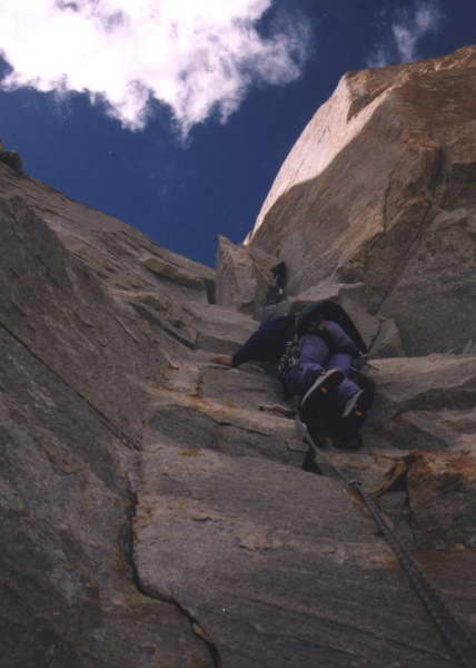 На следващия ден издраскваме до края на парапетите и докато катеря двете въжета до мястото за бивак, Николай слиза “факултативно” до Рамото, защото единствените котки на свръзката са се откачили от раницата му и са паднали. Площадката трябва да се разчисти от фирна и това е добре дошло, защото слънцето вече не огрява тура и ми е студено в еспадрилите. Гледката от бивака е прекрасна. Милен реди имена на върхове и прави предположения кой кой е, а на мен ми е достатъчно само да съзерцавам, без да си затормозявам мозъка с допълнителна информация… Нощуваме как да е, все пак това е една хилава площадчица, а не легло.