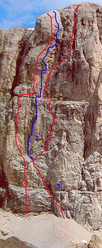 С номер 1 е означен турът на Лархер-Виджиани (Larcher-Vigiani, 8a, 7b obl., 550 м), преминат от Роландо Лархер и Роберто Виджиани (Roberto Vigiani) на 12 август 2001 г. Марио Принот (Mario Prinoth) и Бруно Педерива (Bruno Pederiva) са автори на първото изкатерване без употреба на изкуствени опорни точки – за 12 часа през 2005 г.