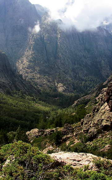 Наричана е често “Планина сред морето” – при средна надморска височина 568 м има 45 върха над 2000 м. Най-висок е Монте Чинто (Monte Cinto, 2706 м). GR20 (Haute route in Corsica) преминава през повечето от тях. Има дължина 180 км (между селищата Календзана и Гонца).