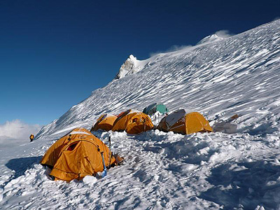 Лагер 3, в далечината вдясно се вижда връхната точка Манаслу на (8163 м)
