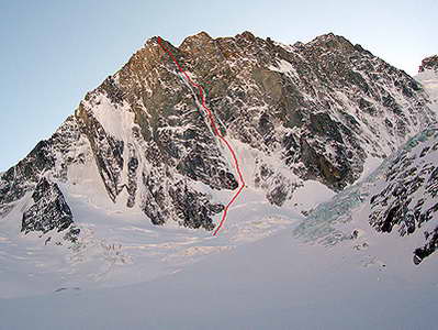 Ледените условия по стената бяха идеални и швейцарецът премина долната й част по маршрута на Колтън-Макинтайър. След това изкатери две въжета по отвесен лед от маршрута “Alexis” на Габару-Беноа (Gabbarou-Benoit) от 1993 г. После се върна на оригиналната линия на Колтън-Макинтайър, която по скално-микстов терен го изведе право до Поант Уокър (Pointe Walker, 4208 м). Общо 1100 метра катерене за невероятно време!