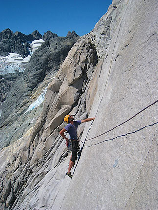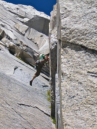 Джош Бъкнър води въже по една от пукнатините (5.10) по маршрута “Voces en la Noche” (V 5.11 A0) веднага след пандюла