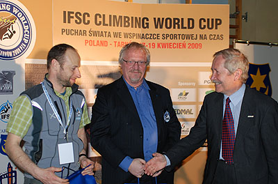 Президентът на Полския алпийски съюз проф. д-р Януш Онишкиевич (Janusz Onyszkiewicz, вдясно) поздравява главния съдия на състезанието в Тарнув –немеца Йоханес Алтнер (Johannes Altner), и генералния секретар на Международната федерация по спортно катерене (IFSC) – холандеца Райндерт Лензелинк (Reindert Lenselink)