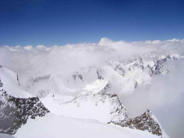 Броуд пик (в облаци) и К2 (на заден план), както се виждат от върховия гребен на Гашербрум 2. Снимка Боян Петров, 1 август 2009 г., 13:14 ч.
