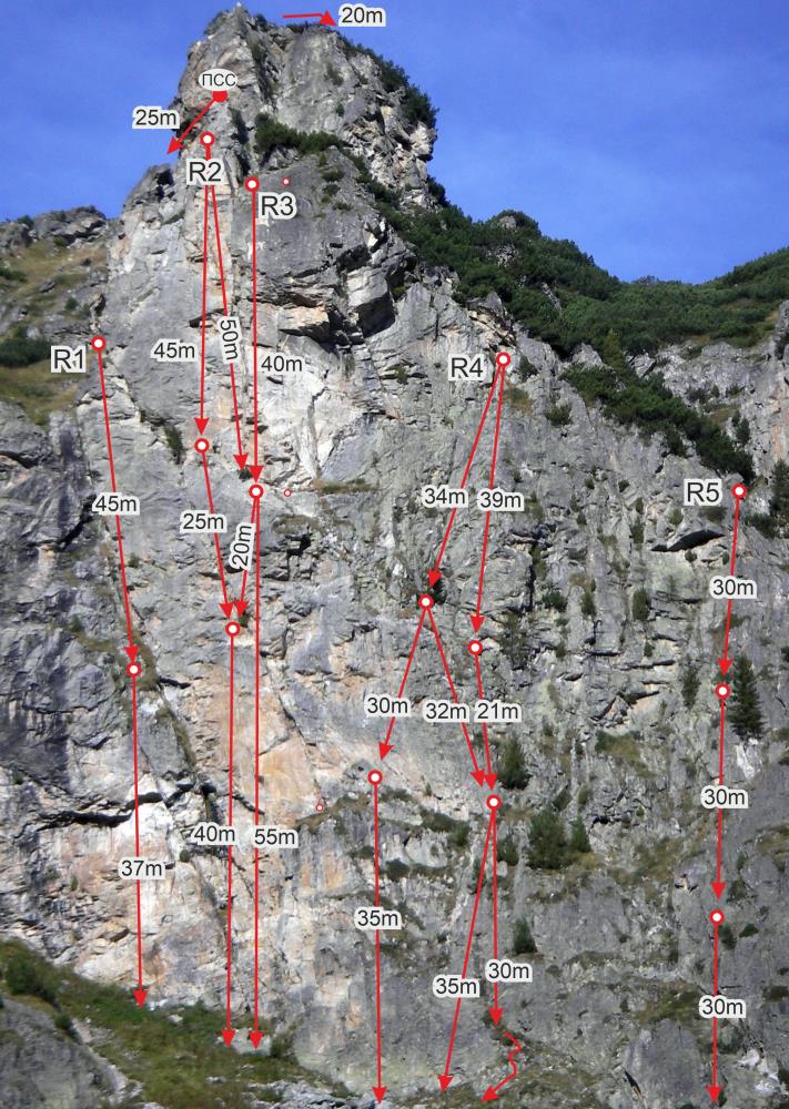 Има и една още една нова скица - с рапелните пътища по стената, като са означени дължините на отделните рапели. Това трябва да помогне за избора на въже при планиране на изкачване и връщане по различните турове.