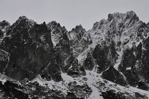 Снимка на цялата стена (вляво) и обкръжението й (отдясно наляво) – Междинния гребен (Posrednia Gran), Тъмната Кула (Ciemniasta Turnia), Големият параклис (Wlk. Kaplica) и Голямата катедрала (Wlk. Kosciol)