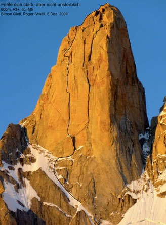 Негов автор е швейцарско-италианската свръзка Роже Шели (Roger Schäli) и Симон Гийтл (Simon Gietl), които преминаха премиерно североизточната й стена. Прокараната след четиридневно изкачване в алпийски стил линия бе наречена “Fühle dich stärker aber nicht unsterblich” (600 м, A3+, 6c, M5).