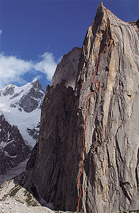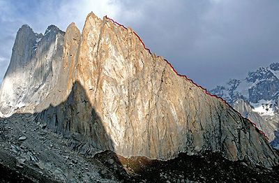 Западната стена на Денбор Брак (4800 м) в долината Нангма, означена е линията по южния гребен “Good From Zafar, But Zafar From Good”