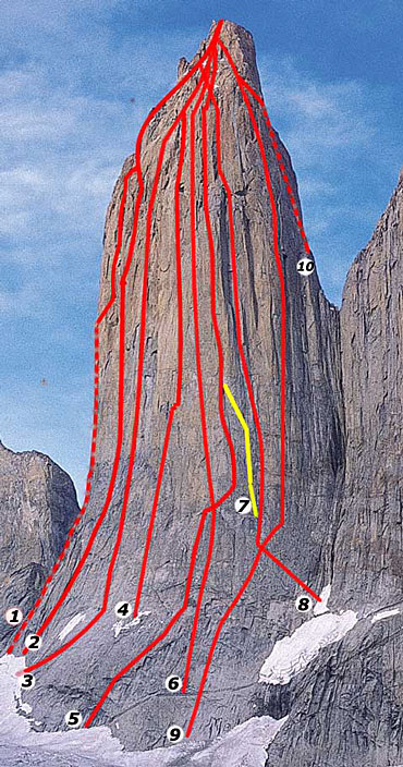 *Турът “Una Fina Linea de Locura (6b A3, 1100 м, 31 въжета) е прокаран от аржентинците Рамиро Калво (Ramiro Calvo), Диего Луро (Diego Luro) и Теодоро Пласа (Teodoro Plaza) през януари 1993 г. На долната снимка е под номер 9.