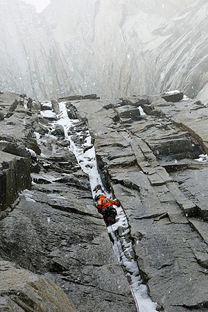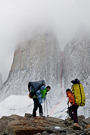 Хансйорг Ауер и Мъч Майр на фона Централната и Северната кула Пайне с линията “Waiting for Godot”