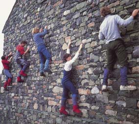 Група катерачи се забавляват (и провеждат добра тренировка на пръстите си) върху каменната стена на една планинска хижа.