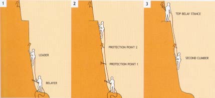 1. водач / осигуряващ Водачът, осигуряван от втория, се катери оставяйки, осигуровки на стената.