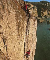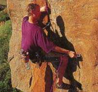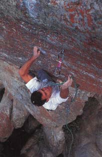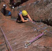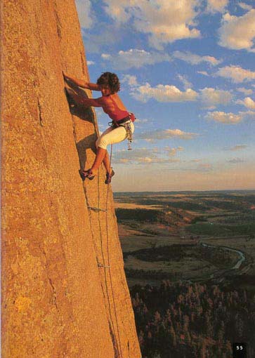 Изживяването при водене е съвсем различно от катеренето като втори или на горна осигуровка. При водене въжето, което сте изкачвали десетки пъти на установ ка, може да ви се стори по-гладко и по-стръмно, отколкото при предишните ви катерения. Скалните демони на страха сякаш ви дърпат за краката, прибавяйки килограми върху нормалното ви тегло, отслабват мускулите ви и замъгляват ума ви. На тази снимка френската катерачка Катрин Дестивел показва предимствата на дългогодишния си опит с изящният си стил на катерене.