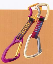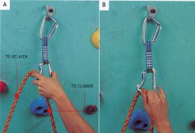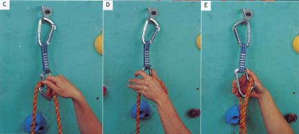 Примките обикновено се състоят от един карабинер с права ключалка, който се закачва за клина или планката на болта, и един с извита, в който се включва въжето. Така е по-лесно да се определи кои карабинери стоят откъм скалата - те по-бързо се очукват и одират и могат да повредят въжето, затова следете редовно състоянието им. Извитата ключалка позволява по лесното закачване на въжето - важен фактор, когато частица от секундата може да ви дели от падането. Когато се закачвате, внимавайте въжето да излиза от карабинера в посоката ви на движение и свободният край (този, който идва откъм осигуряващия) да влиза от долната страна (откъм скалата). Въжето не трябва да преминава над ключалката, за да не я отвори. Когато се закачвате, предупреждавайте партньора си (например "Закачвам се" или "Отпусни"), за да може да ви отпусне необходимото въже (корем). Издърпайте само толкова въже, колкото ви е необходимо (това се научава с натрупването на опит), и го включете със свободната си ръка. Ако е възможно, закачвайте се, докато почивате, ако не, дръжте се с изпъната ръка, за да пестите енергия. Има много начини за бързо включване на въжето в примките. Тренирайте ги с всяка ръка и изберете най-подходящите варианти за всяка ситуация. Във всички случаи, въжето, водещо към седалката на водача, трябва да излиза от горната страна на карабинера, а свободното въже (краят, който води към осигуряващия) - откъм скалата.