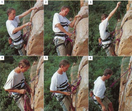 1. Когато достигнете последната осигуровка на тура, закачете се с две отделни примки за два отделни болта (хубаво е ключалките на карабинерите от двете примки да са ориентирани в различни посоки - Б. пр.). 2. Хубаво е първо да закачите примка на единия болт, после да прекарате въжето през нея и чак след това да сложите втората примка и да я закачите пряко за седалката. (Запомнете: може да сте уморен и да паднете, докато се опитвате да закачите примката за седалката.) Закачете се директно за седалката и с първата примка. 3. Увиснете на примките, накарайте партньора да ви отпусне въже, направете осмица на въжето на известно разстояние под вас и я закачете с карабинер за ухото на седалката си. Това е предохранителна мярка, в случай че примките по някакъв начин все пак се откачат. 4. Чак сега се развържете, прекарайте въжето през халката за спускане и пак се вържете. Проверявайте всичко по два пъти. 5. Развържете осмицата от средата на въжето и накарайте партньора да ви обере. Проверете отново всичко и се откачете от примките. 6. Партньорът може вече да ви спуска на земята. |