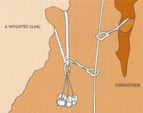 примка с допълнителна тежест // заклещен камък *Заклещените камъни и допиращите се в една точка скални издатъци могат също да бъдат полезни - следете за такива, когато се катерите по цепнатини.