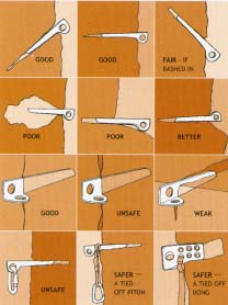 Съществуват различни средства за осигуряване (активни и пасивни). Хубаво е човек да знае как да използва клинове, клеми, френдове. Клиновете Въпреки че в наши дни се използват рядко, човек може да намери разнообразни форми и размери клинове (метални пластини, снабдени с ухо, които могат да се забият в цепки). Всеки тип се използва в за точно определени случаи: има клинове за хоризонтални цепки; V-образни те се използват в по-широки; пластините вършат добра работа в глухи и задънващи цепки; има дебели парчета метал с много дупки, които могат да се използват в много широки цепки. Забиването на клин е сравнително лесно - изберете такъв, който да влезе без голямо усилие на около три четвърти от дължината си в цепката, след това го дозабийте с няколко силни удара с чука. "Изтъняването" на звука обикновено показва, че сте го забили добре, въпреки че сигурността на клина се определя от характера на скалата и от дълбочината, на която е влязъл.