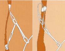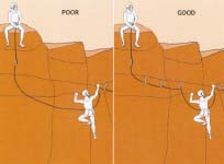 отляво: Пускането на рапел на помощно въженце през една опорна точка е допустимо само в най-краен случай! отдясно: Ръбовете на планките могат да скъсат въжето.