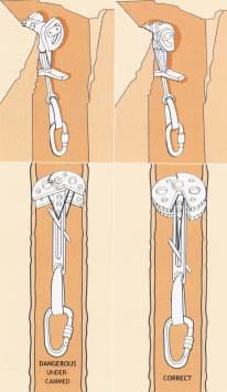*Уверете се, че клемата не може да изскочи от цепката. *Подредете по няколко клеми или ексцентрици с различни размери на един карабинер - това ще ви позволи по-лесно да изберете правилната големина за съответната цепка; заклещете добре клемата, после я извадете от карабинера и чак тогава се закачете с примка.