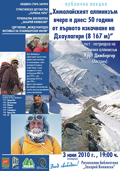 Курт Димбергер пристига на 1 юни т. г., почти веднага след посещението си в Катманду, където участва в тържествата по случай 50-ата годишнина от премиерата на Дхаулагири (8167 м). На следващия ден ще посети Розовата долина (негова мечта от детинство) и Долината на тракийските царе в околностите на Казанлък. На 3 юни преди обяд ще бъде приет от областния управител Йордан Николов. Вечерта от 19.00 часа е неговата презентация на тема “Хималайските алпинизъм вчера и днес – 50 години от първото изкачване на Дхаулагири”*. В последния ден от пребиваването си ще посети Пловдив и Бачковския манастир.