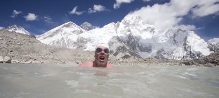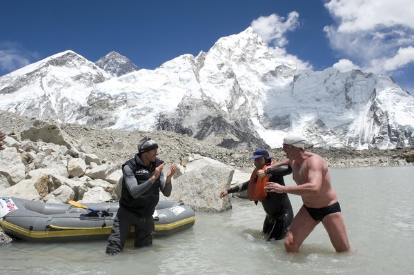 Както съобщава Press Association, 40-годишният британец Люис Гордън Пю (Lewis Gordon Pugh) е първия човек в света, който успява да преплува ледниково езеро в масива на Еверест – само с плувки, защитни очила и шапка.