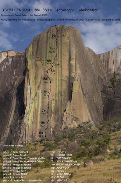 Историята на “Tough Enough” – невероятната линия, която върви по източната стена на Карамбона (Karambona) в масива Цараноро на Мадагаскар, започва от 2005 г. Тогава е прокарана от немските катерачи Ари Щайнел (Ari Steinel) и Даниел Гебел (Daniel Gebel). В следващите години по нея не бе направено нито едно цялостно чисто (без изкуствени опорни точки) изкачване. В този период отделни въжета бяха преминати на класика от британски и френски катерачи. През годините турът “Tough Enough” беше катерен на части заедно с модификация на отделни пасажи, което – според замисъла на катерещите – трябваше да направи цялото му протежение по-логично.
