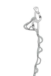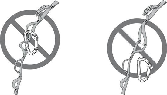 НИКОГА незакачайте един карабинер през повече от един клуп едновременно. Ако карабинера мине през шевовете разделящи примката на части и бъде натоварен динамично, няма да може да ви задържи за дълго. Това се случва единствено когато сте включили два клупа едновременно в един и същ карабинер.
