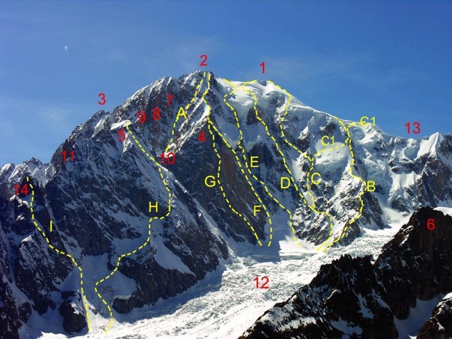 H – Егюий Бланш дьо Пьотере (Aiguille Blanche de Peuterey 4114 м), източната стена, историческият маршрут на Паул Гюсфелд (Paul Güssfeldt), Емил Рей (Emile Rey), Кристиан Клукер (Christian Klucker) и Сезар Олие (César Ollier), 15 август 1893 г.,