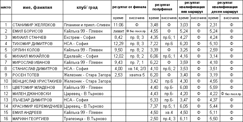 Така се получиха изненади. Някои от претендентите за тройката се прецакаха. Михаил Станчев обаче стана трети на първото си състезание по ледено катерене. Той умело пренесе върху леда спортно-катераческите си способности.