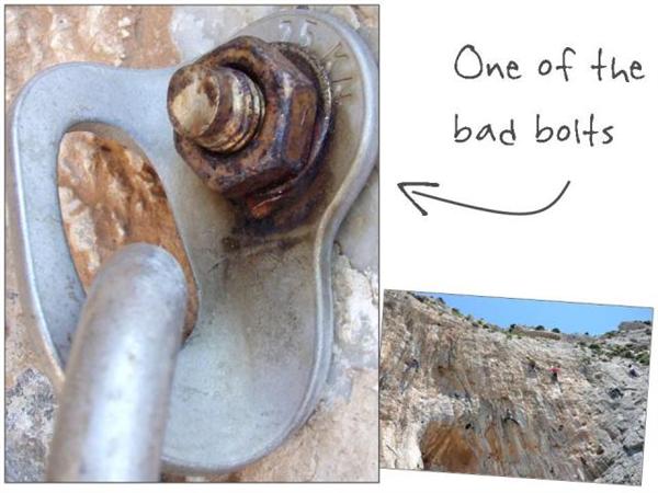 Проблемът с болтовете на Калимнос е още по-сериозен. Когато бях там преди няколко години ми направи впечатление, че е ковал кой ли не и с какво ли не... Набляга ли са на количеството турове, но за сметка на качеството. По принцип в такива морски райони трябва да се използват материали от специална неръждаема стомана. Повечето болтове обаче изобщо не бяха от никаква неръждавейка, камо ли "морска" неръждавейка и съответно вече бяха ръждясали. Така че, който ходи натам, е желателно да внимава "по принцип".