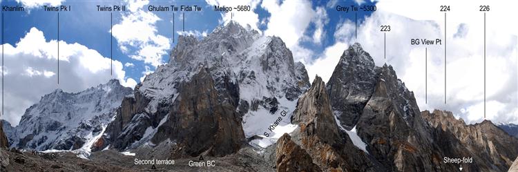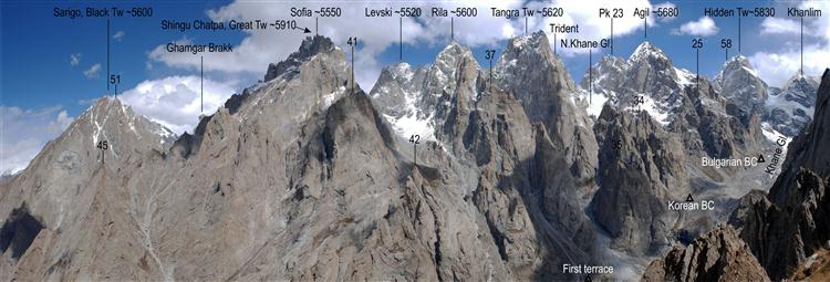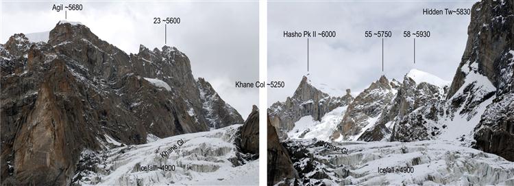 The main peaks situated on the left-hand side of the glacier above Khane Col are Hasho II (~6000 m), Peak 58 (~5930), Hidden Tower (or Peak 59, ~5830), Khanlim (Peak 60) and the Twins. On the right-hand side of the glacier are Peak 23 and Agil (~5680). At the base of the Twins’ north wall, the Khane Glacier abruptly turns west along the north slopes of the southern ridge.