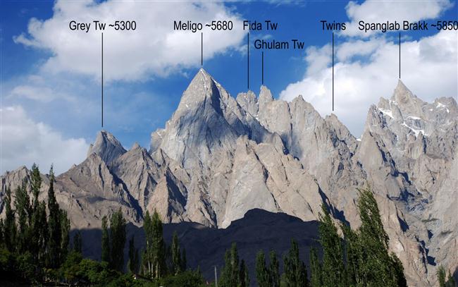Immediately before sloping down to the Hushe Valley, the left-hand (southern) ridge has two main peaks: Meligo (~5680 m) and Grey Tower (~5300 m). Meligo Peak is separated from the Twins to the east by a saddle that can be reached by an iced gully between the Twins and the Saws Ridge. Seen from the north (from Khane), Meligo is characteristic with two big rocky arêtes, named the Ghulam and Fida Towers (~5200 m), which rise from the main ridge coming from the east. To the west, it is connected to Gray Tower. Down to 4400 m, Meligo’s northern slope is covered with the South Khane Glacier. This can be crossed and, after a small saddle and crossing a steep gully, the saddle between Meligo and Gray Tower is reached at 5000 m. After Gray Tower, the ridge (~4800 m high) gradually slopes down to the valley at Khane Village (2800 m).
