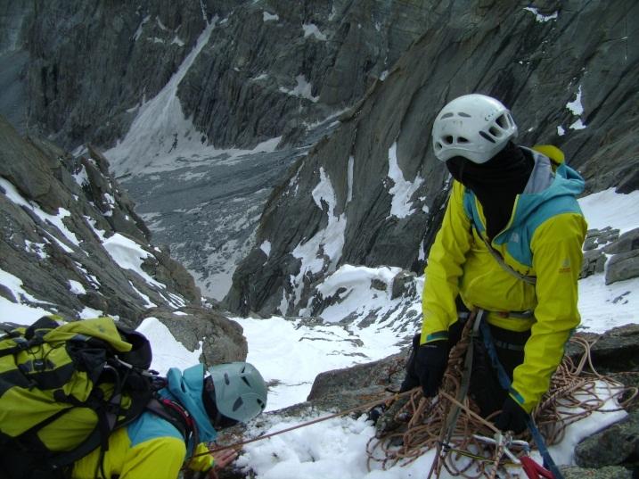 20.08 – След изгрева на слънцето в чудесни метеорологични условия в 6:00 Н. Петков и Д. Боянов се отправят в лек стил за изкачването на вр. Сивата кула. След 13 въжета и преодоляни скални пасажи от 5 до 7 категория по UIAA, двамата излизат на върха. Измерена е височината на 5435 м. От тук в 10:30 поемат по обратният път към превала. След 13 рапела в лоши условия двамата достигат до превала. При организирането на рапели са оставени 26 скални клина на площадките. Поради голяма опсност от каменопади в кулоара между върховете Мелиго и Сивата кула, двамата остават да нощуват на превала.