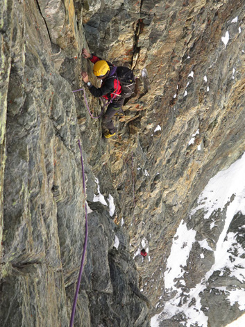 Първата част от него водеше по покрити с тънка ледена кора плочи и ги изведе до отвесен участък, където намериха първия клин. След дълъг траверс надясно стигнаха до винкел. След излизането от него наклонът намаля, но започна участък, който предложи катерене по крайно ронливи скали.