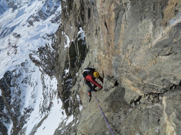 След подход със ски тримата тръгнаха по кулоар, по който преминаха 600 м ледено-снежен терен от стената с наклон до 70° и средно големи трудности. След два часа катерене стигнаха до 400-метров скален монолит, на който се намират основни трудности по маршрута. Вече без котки и ледокопи те тръгнаха по този фрагмент от стената.