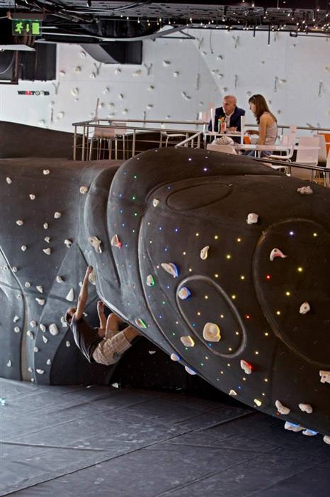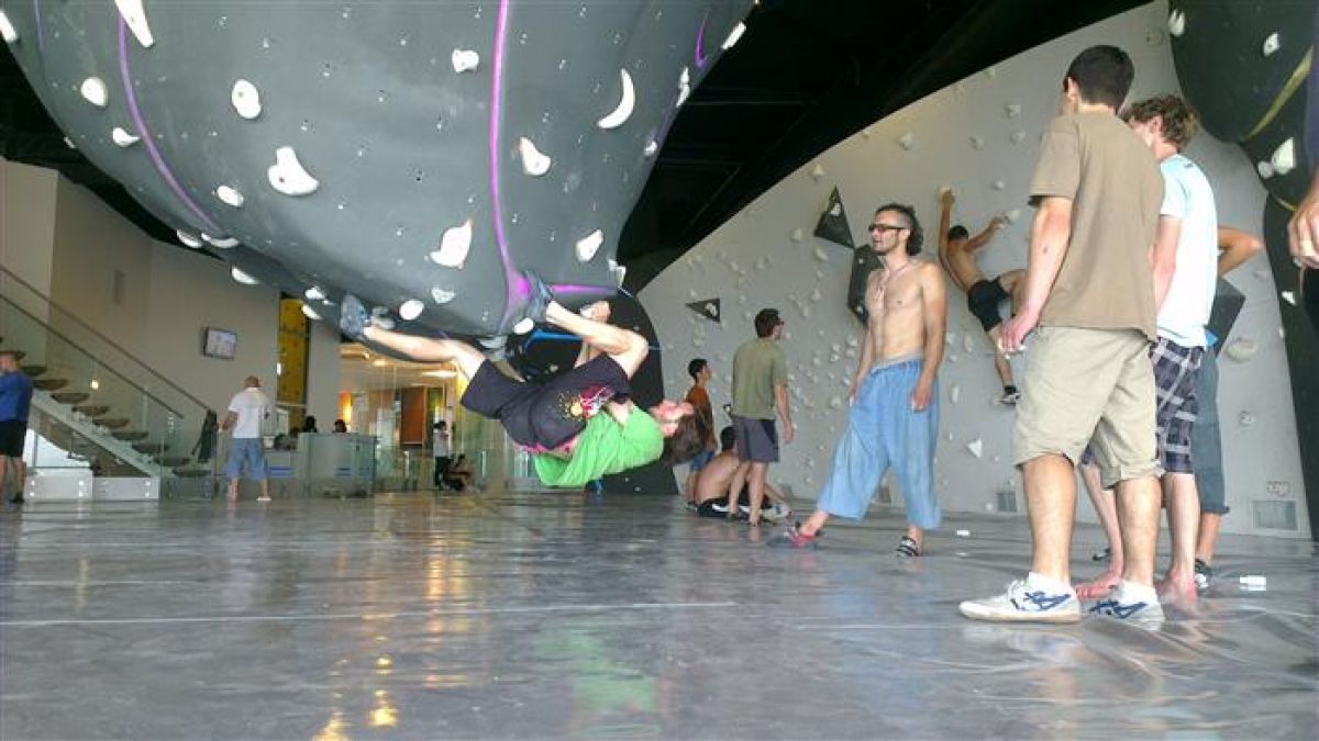 Съчетанието с добре обслужен бар е желателен за всяка катерачна стена. В случая това е "Climbar". Сн. boulderland.eu